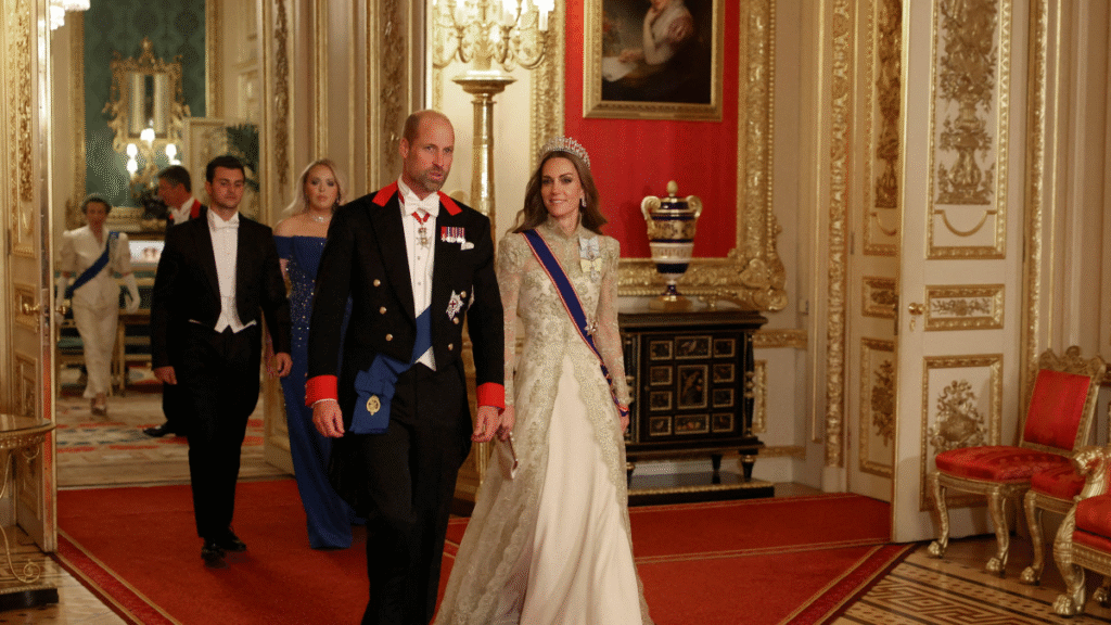 Beside her, Prince William’s tailored navy tuxedo offered the perfect balance of tradition and subtle strength. Yet it was Catherine who commanded the room, her aura impossible to ignore. Their shared glances carried the weight of duty and affection — two figures who have grown together through the prism of the public eye, now standing effortlessly as the heart of the monarchy’s future.