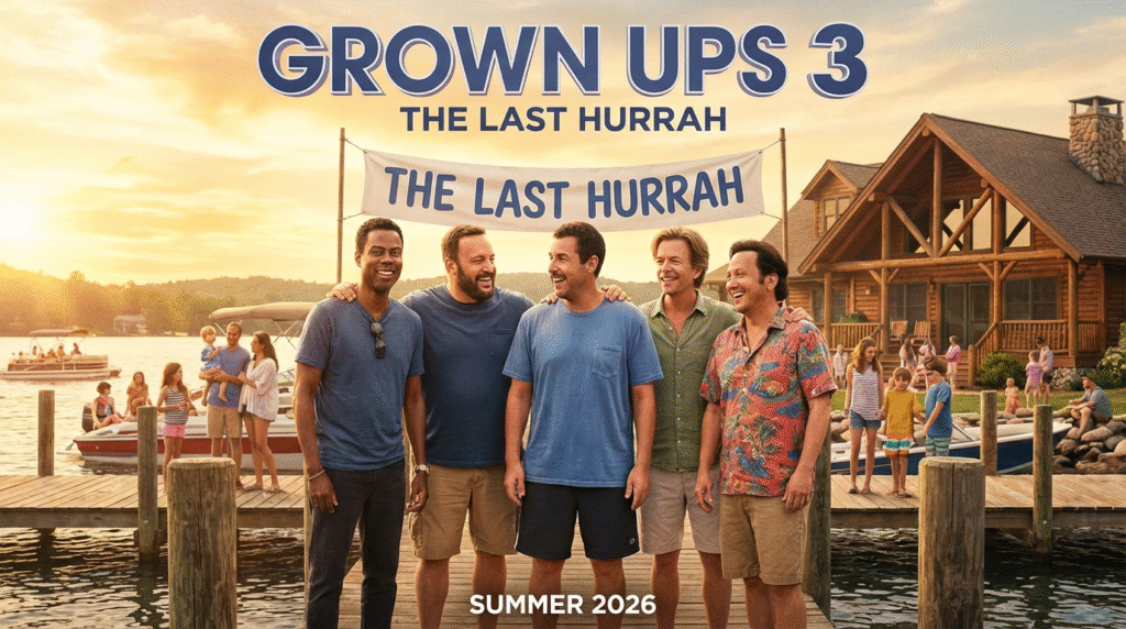Get ready for a wild ride this holiday season in Grown Ups 3: The Last Hurrah (2026), where the gang is back and bringing their signature chaos to Las Vegas for one final bachelor party. This time, the festivities are bigger, the stakes are higher, and the antics are even more absurd. Lenny (Adam Sandler), cocktail in one hand and a candy cane in the other, leads the charge, his confused yet determined expression showing his attempts to keep the holiday celebrations from going completely off the rails. The stakes are high, but Lenny is ready to take on Vegas in his usual bumbling yet lovable fashion.