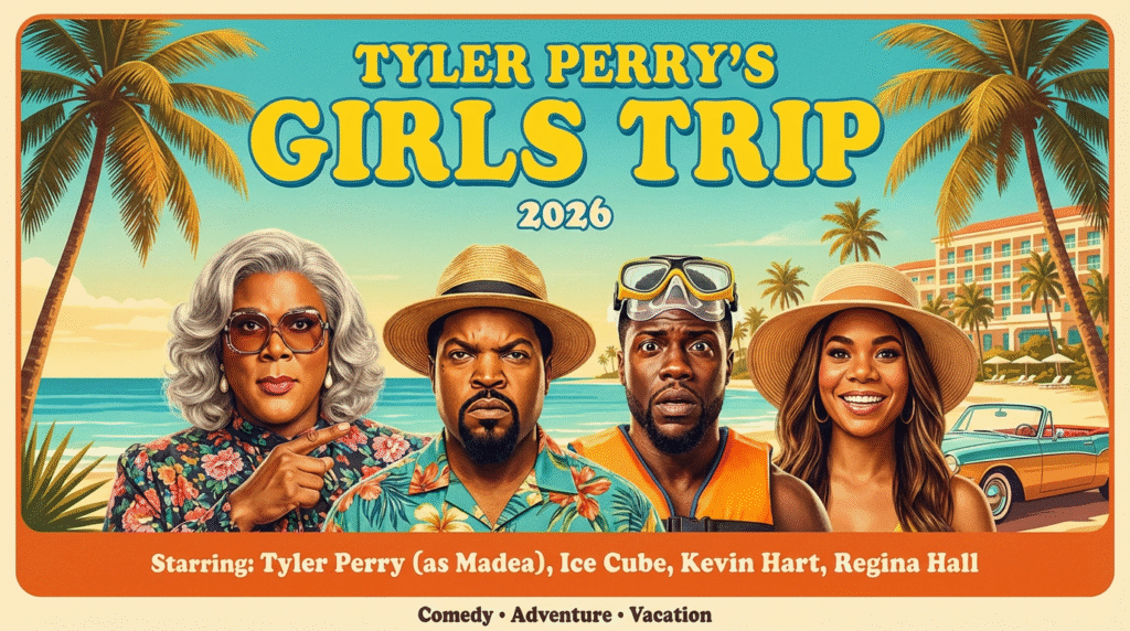 Get ready for a vacation like no other in Tyler Perry’s Girls Trip (2026), where the usual tropical paradise setting becomes the backdrop for a hilarious adventure full of mayhem, mischief, and plenty of laughs. The legendary Madea (Tyler Perry) is back, and this time, she’s bringing her chaotic brand of humor to a vacation that no one will ever forget. With a cocktail in one hand and a massive suitcase in the other, Madea is ready to make a statement, sipping her drink by the pool and causing all kinds of trouble while her reluctant companions—Ice Cube and Kevin Hart—try to blend in with their ridiculous disguises
