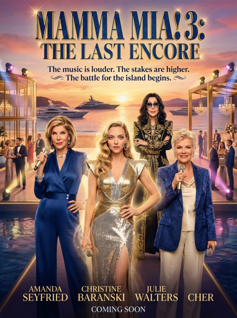 Get ready for the final chapter in the iconic Mamma Mia! series with Mamma Mia! 3: The Last Encore! Sophie (Amanda Seyfried) has grown from a young bride into the confident Queen of Kalokairi, ready to take on the challenges that come with her newfound role. With her graceful composure, Sophie stands at the heart of the island, dressed in high-fashion couture, holding a microphone, and leading the charge as she guides the island into a new era. With her royal presence and commanding authority, Sophie’s transformation is complete, but the path ahead is filled with fierce competition and personal battles.