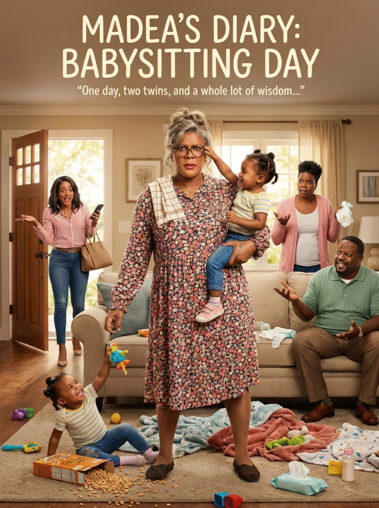 Get ready for the wildest babysitting adventure yet in Madea’s Diary: Babysitting Day! Madea (Tyler Perry) is back and taking charge of one of the most chaotic, laugh-out-loud days of her life—babysitting her mischievous twins. With one twin in her arms, the other wreaking havoc, and the room turned into a warzone of scattered toys and food fights, Madea is doing her best to maintain control. In her floral dress and oversized glasses, her tough but loving nature shines through, revealing her true comedy genius as she desperately tries to keep everything from spiraling out of control. Despite her efforts, it’s clear: in the world of Madea, chaos is just a part of the fun.
